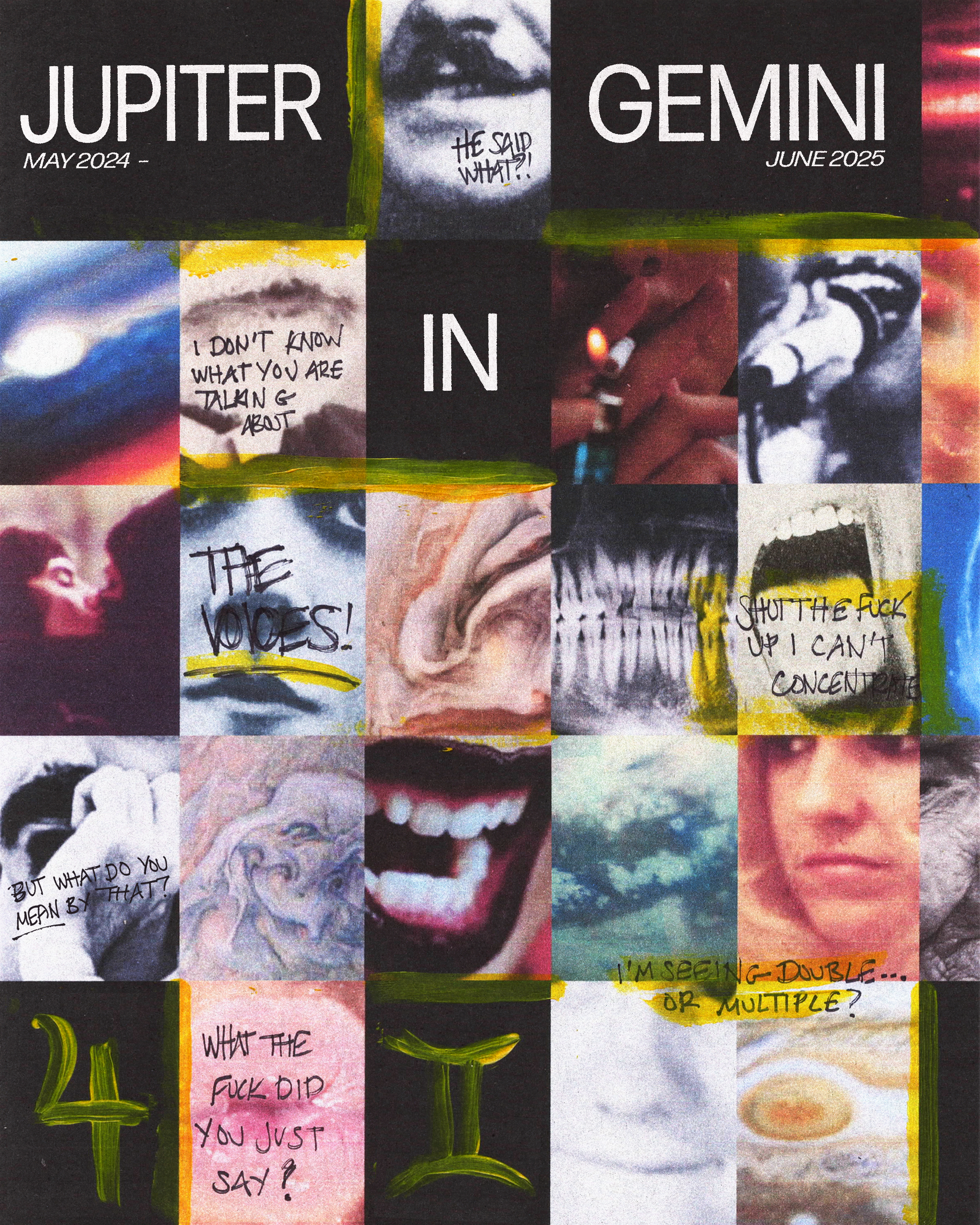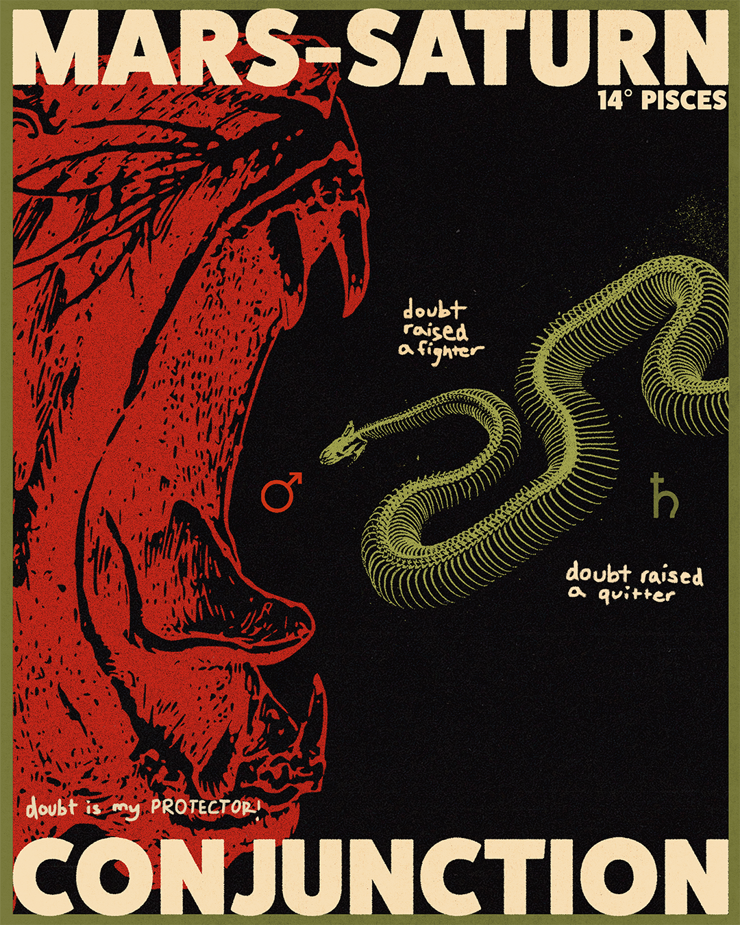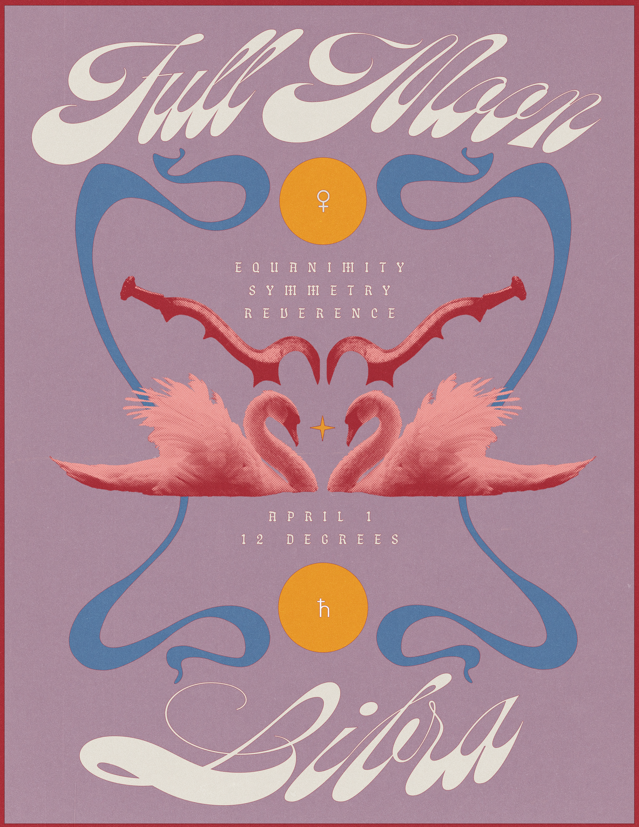 A devotion to recent and current astrological alignments and lunations that shape our lived context. These eclectic and intricate poster designs create a visceral, divinatory experience by portraying the nuances of each astrological alignment through color, image, typography and symbol.